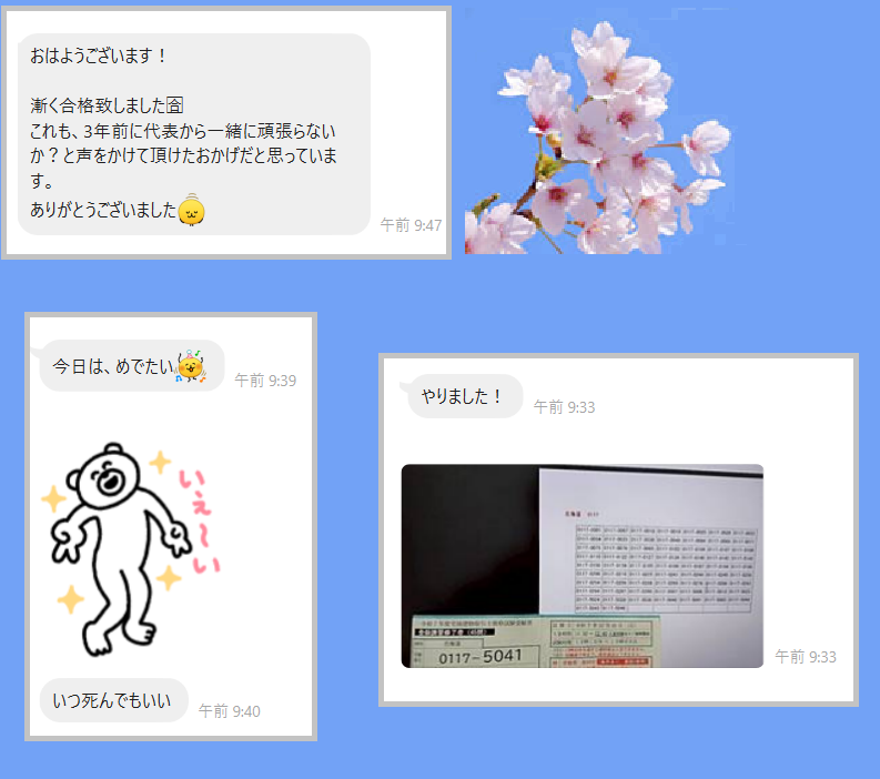 先ほど、宅建の合格発表がありました。3名スタッフから、直接、ラインがありました。