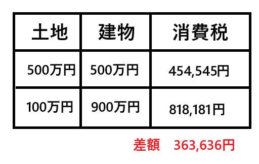 さっきの例で、消費税がどれくらい違うか見てみると、下の表のような感じになります。建物500万円は税込み価格で、その中に含まれている消費税は約45万円。建物900万円とした場合は約81万円の消費税が含まれているということになります。