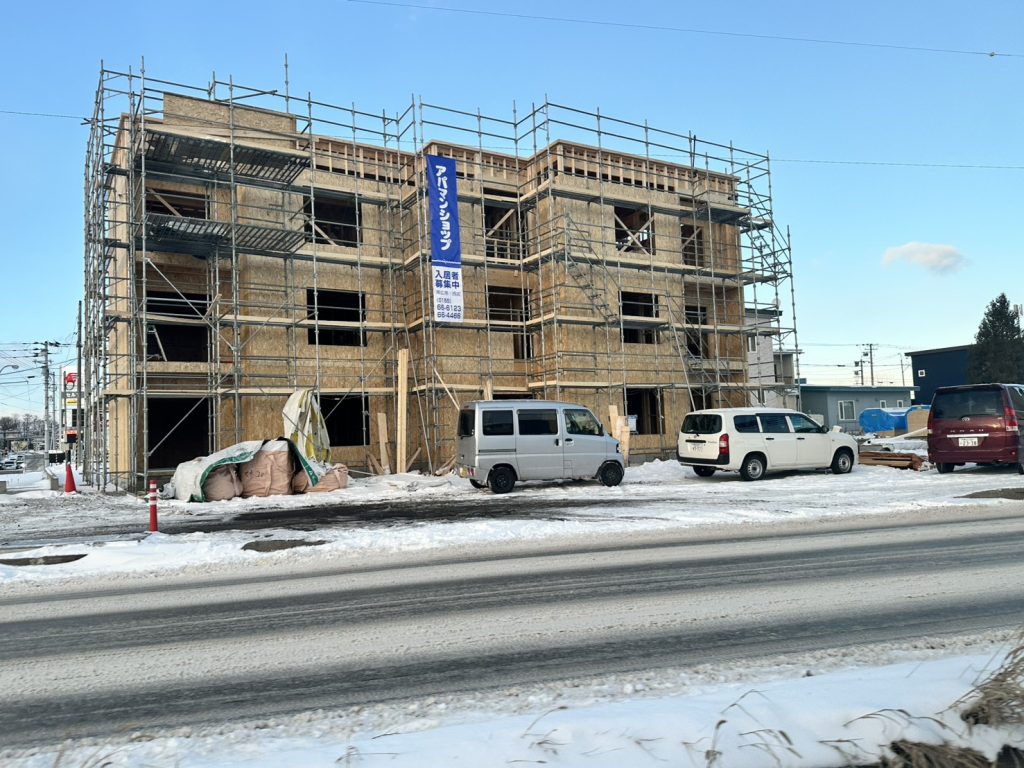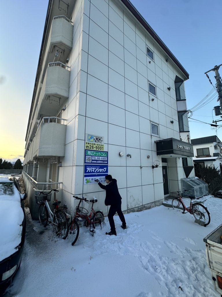 新築物件の募集看板、既存アパートに貼っている問い合わせ看板の設置、張替えは、基本、アパマンショップのスタッフと、営繕のスタッフで行っております。
