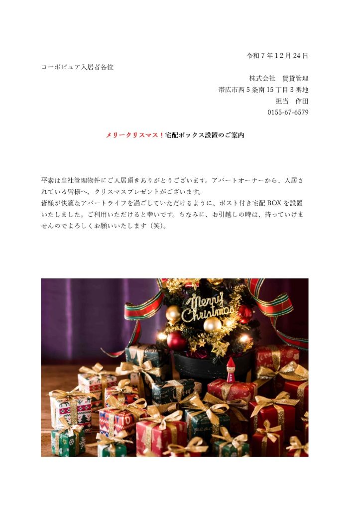 アパートオーナーから、入居者にクリスマスプレゼント企画ありました。