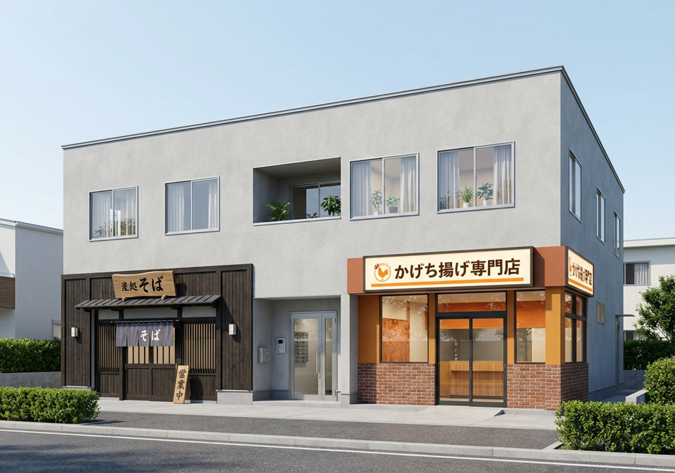 右側唐揚げや、左側蕎麦屋、右側を手前に来るようにイメージ画像を作れって命令。