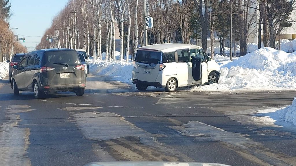 帯広市内、道路脇に高く積み上げられた雪が、道路に出るときに視界を邪魔している状況で、かつ路面もテカテカなアイスバーンになっているので、事故が多発?!しております。