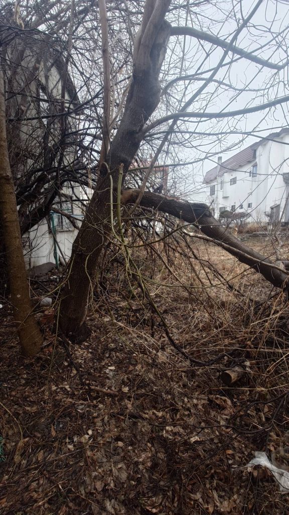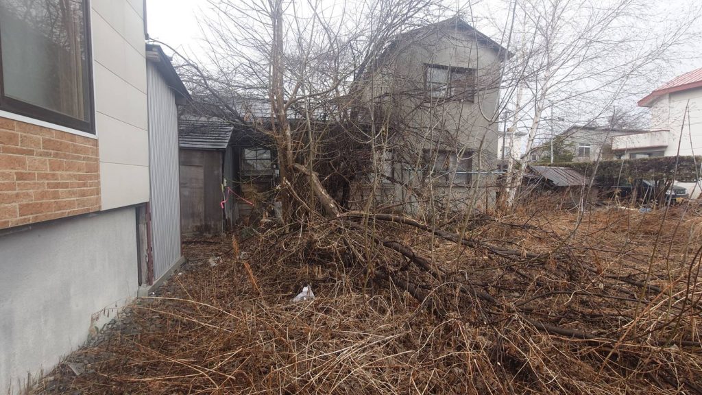すでに我々が取得している土地の隣地に、築50年以上経っているボロボロぼ空家があり(最初の写真)、その空家の庭にある大きな木が、我々の土地に倒れているという状況で(2つ目の写真)この木を何とかしてくださいというのが、弁護士さんに依頼した内容です。